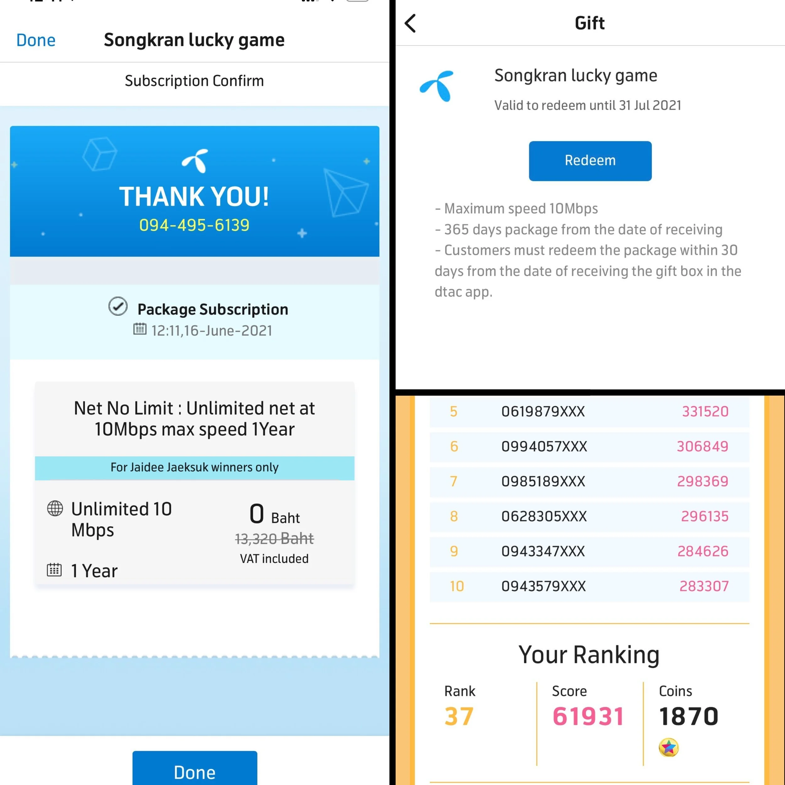 Last month, the Dtac app (service provider) had a mini-game for Songkran festival that you could play to earn points. You played it with coins you earned from topping up for your phone. It was dumb, but the top 100 winners would win one year of unlimited data, so I gave it a try. App informed me this morning that I had won, and now I’m living that free data for a year life. 13,320 baht is around $425.