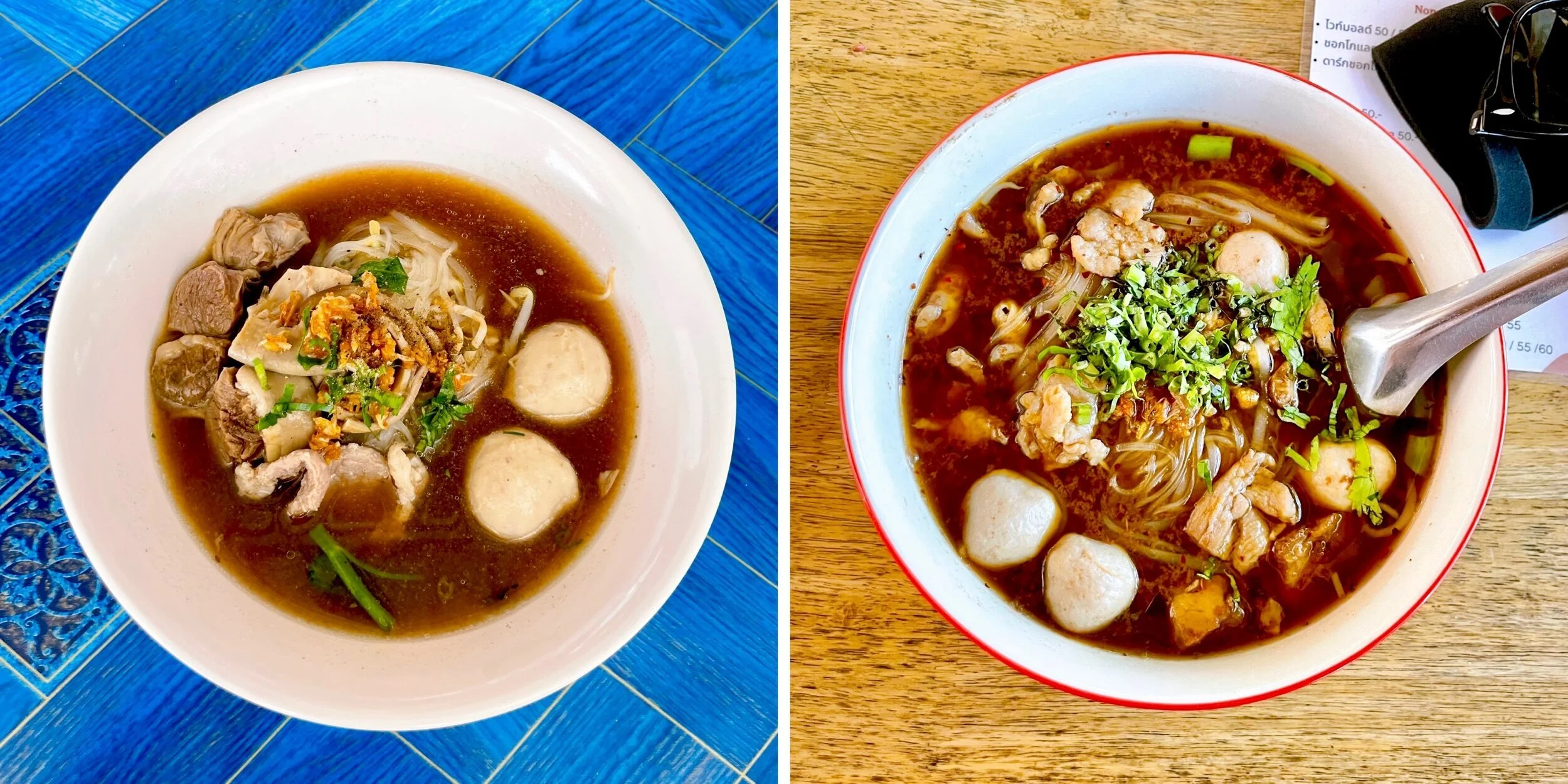 Two different soups and minced pork with basil over rice with some pork broth.